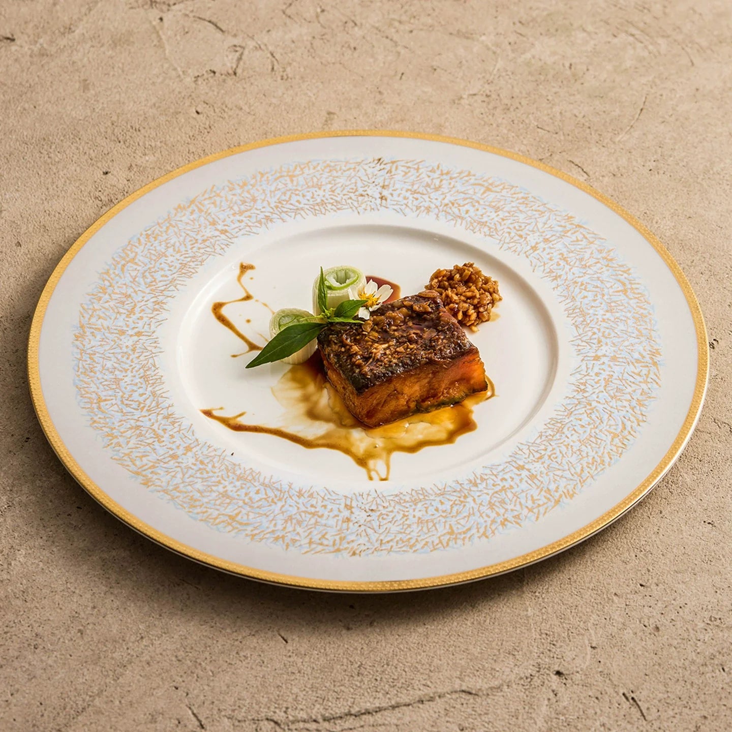 Real gold-brushed edging adds a refined, luminous touch.